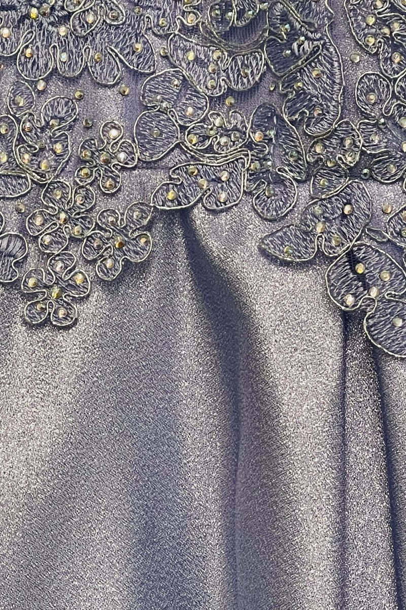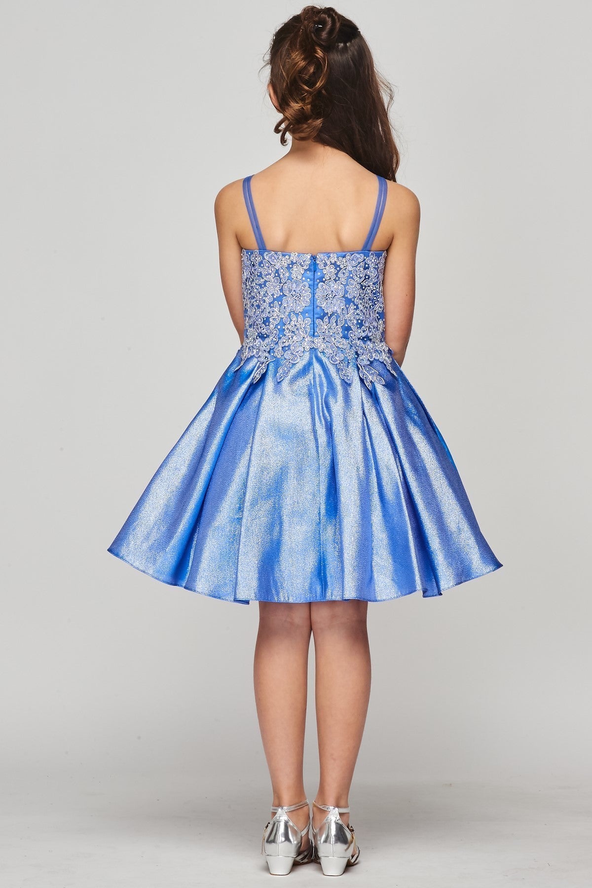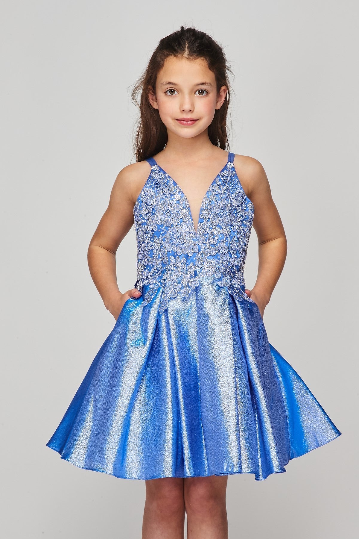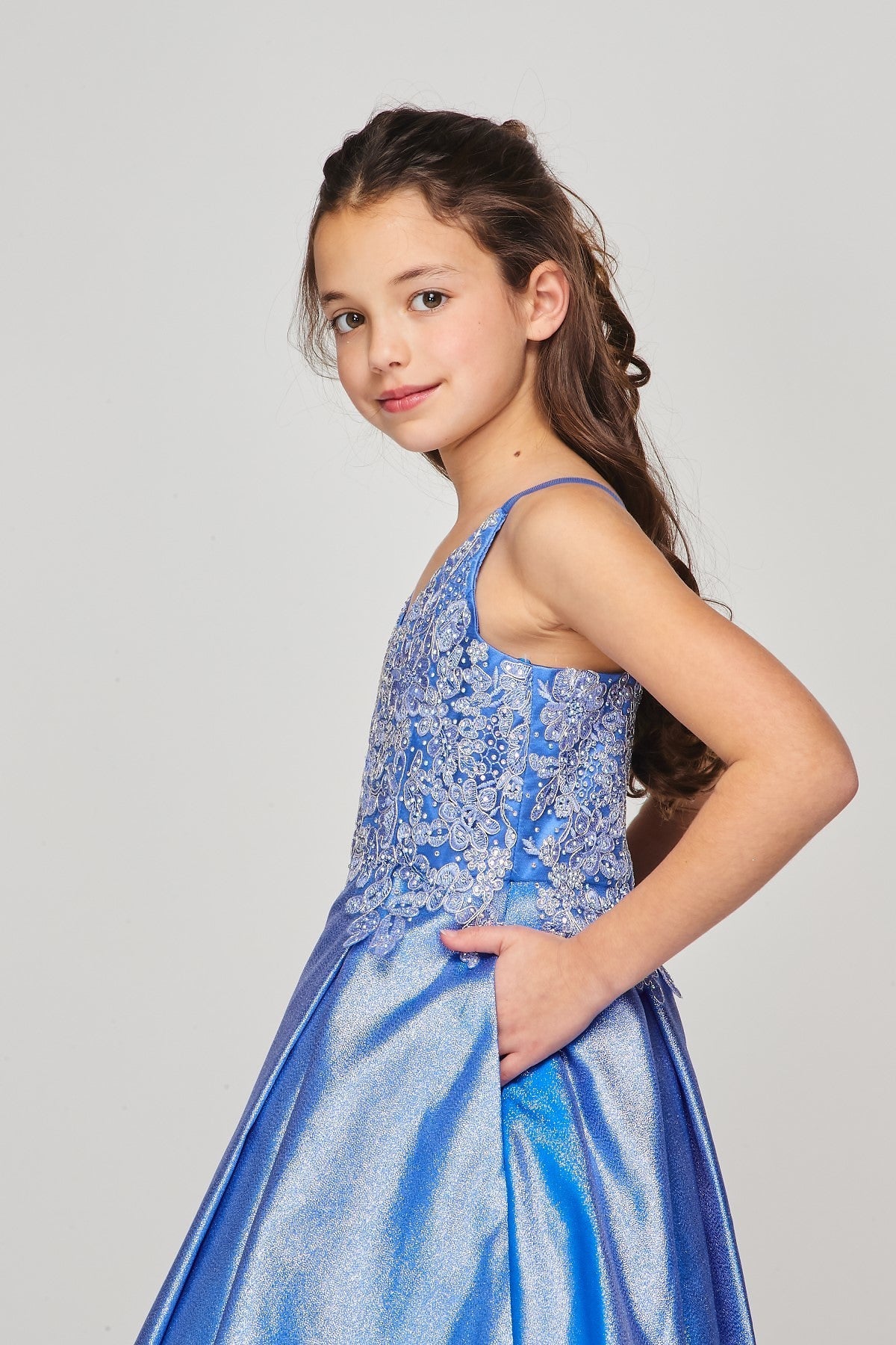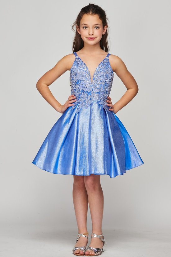 CINDERELLA COUTURE Beautiful spaghetti v neck, adorned with gold trim lace, shinny fabrication dress. Perfect for your special occasion