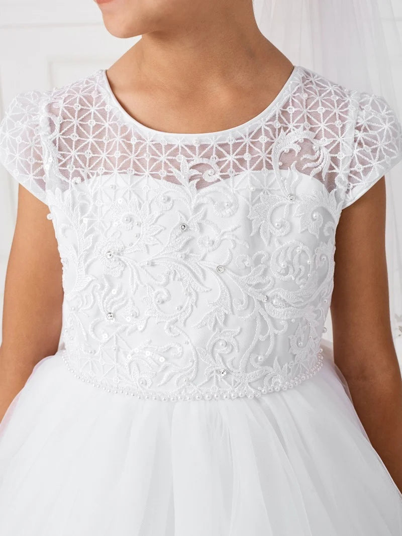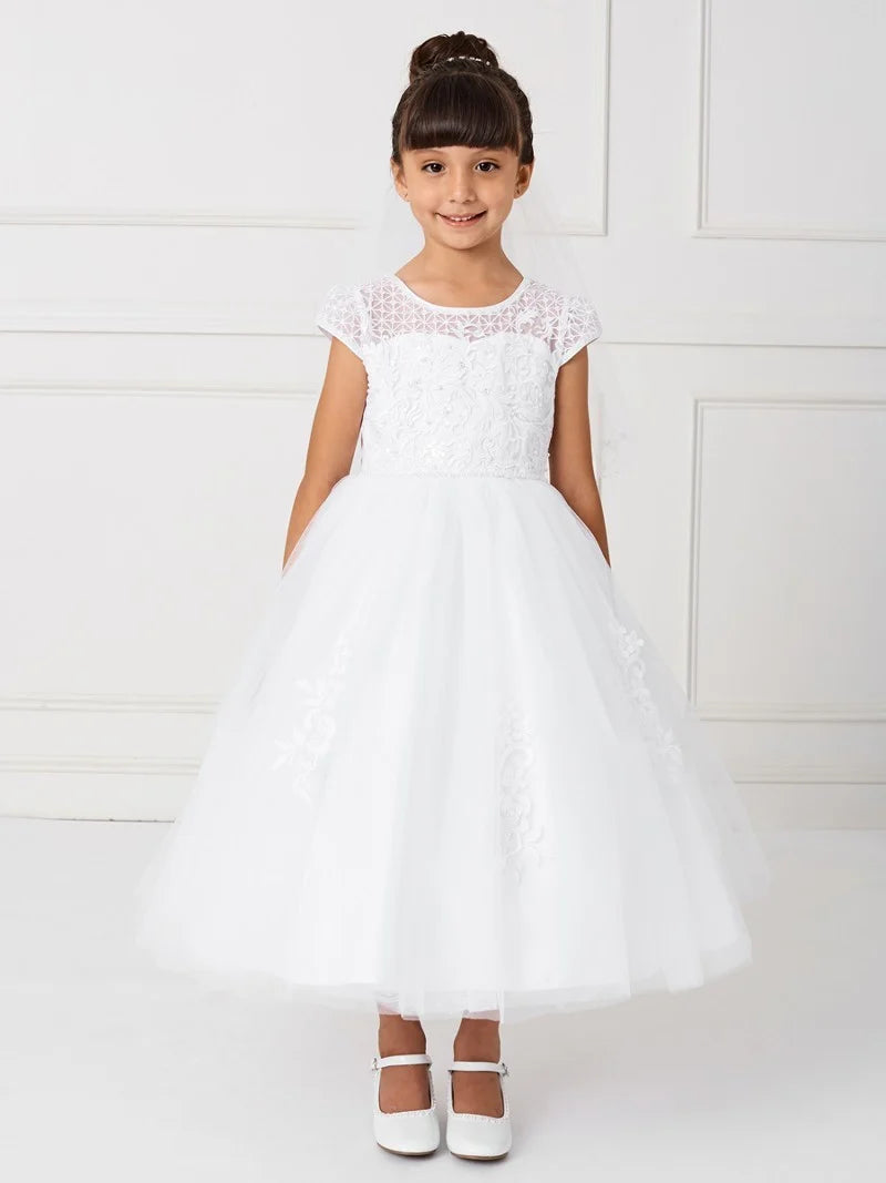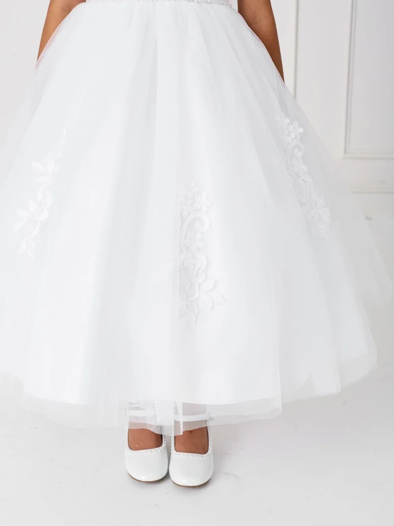 Beautiful cap sleeved lace applique bodice. The tulle skirt also has scattered lace applique.